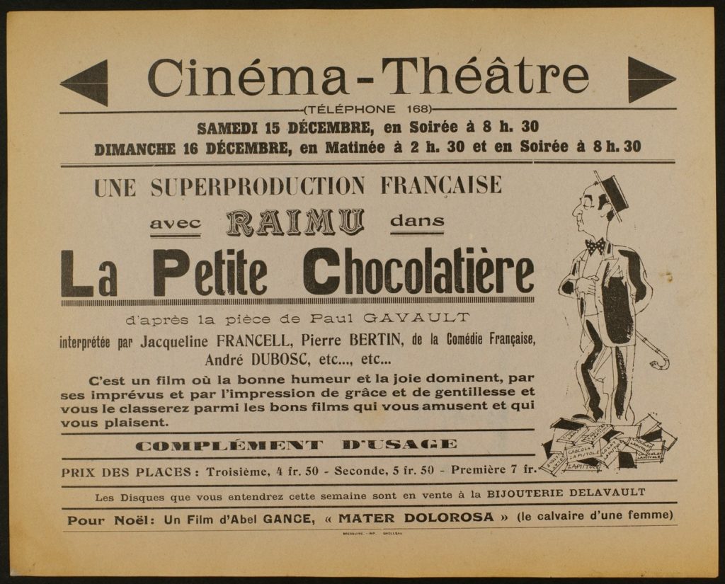Un don aux archives municipales de Bressuire en 2007 par Jacques Benoist, ne représente pas moins de 300 affichettes qui sont classées sous la cote 4 Z. L’une d’elle invite les spectateurs à « une superproduction française avec Raimu dans La Petite Chocolatière, d’après la pièce de Paul Gavault ». Ce film sortit en 1932, est présenté aux Bressuirais le samedi 15 et dimanche 16 décembre. On nous informe que « Les disques que vous entendrez cette semaine sont en vente à la Bijouterie Delavault » et que pour Noël c’est un film d’Abel Gance « Mater Dolorosa » (le calvaire d’une femme) qui sera proposé.
