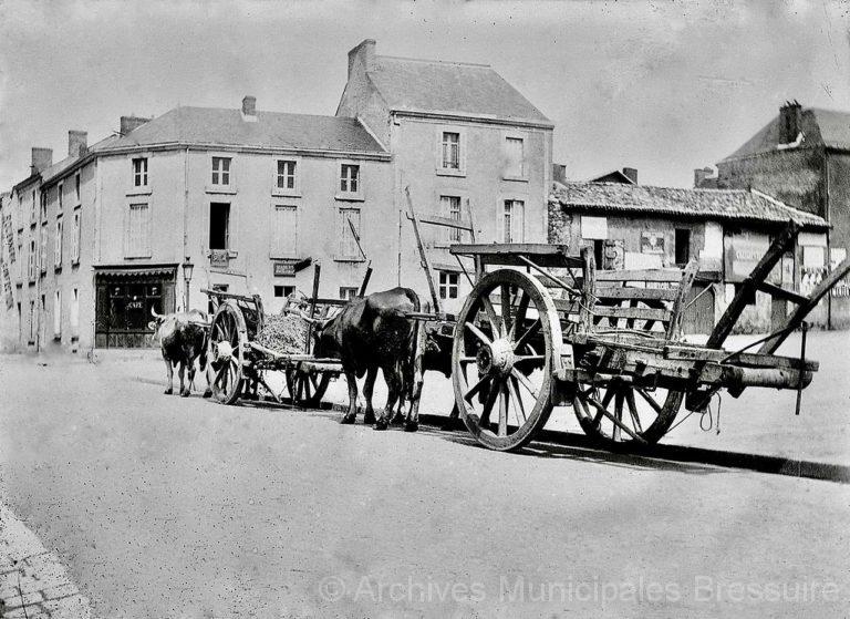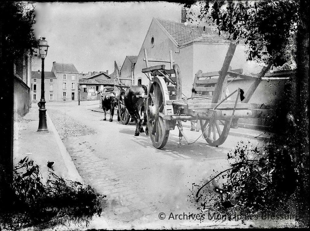 Vers 1895. Mis en valeur par un puissant effet de perspective, deux charrois tirés par des boeufs remontent la rue du Four (actuellement rue du Général André). À leur droite se découpent les murs de la scierie mécanique Ligeard (actuel parking Carnot) dont on devine la haute cheminée de briques au dessus-du toit. Au fond se dessine le triangle de la place Carnot (actuellement place des Anciens Combattants), dont la création est alors récente. Trottoirs et réverbères semblent tout neufs.