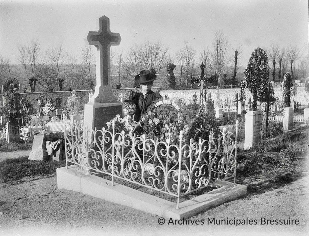 Une femme en deuil (peut-être Hélène Ardouin) pose près d’une tombe fraîchement décorée du cimetière Saint-Simon. Sur une couronne mortuaire probablement composée de perles de verre, on distingue la dédicace : « à notre soeur chérie ». De l’autre-côté du mur du cimetière, on remarque la rangée de têtards qui borde la route et la campagne vierge d’habitations.