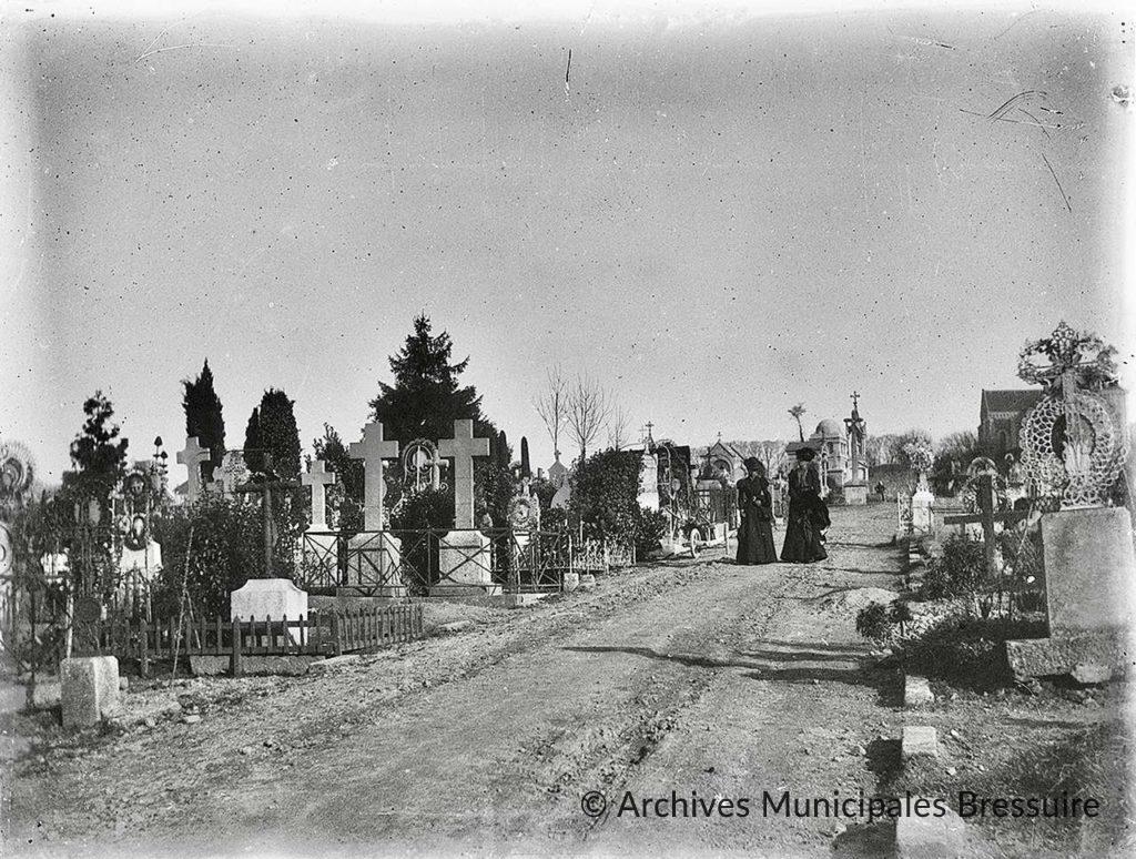Deux femmes en deuil descendent l’allée centrale du cimetière Saint-Simon. Elles appartiennent sans doute à la famille Ardouin-Métayer dont les tombes sont concentrées, avec celles des familles de notables de l’époque, dans la partie haute du cimetière, à l’est. La tombe en granit de Nelly Ardouin, épouse du Docteur Métayer décédée en 1913, se trouve ainsi non loin du mausolée Barbaud (érigé en 1896) qu’on distingue clairement en haut de l’allée. La décoration du cimetière est caractéristique du XIXème siècle, avec ses couronnes à ossatures métalliques placées en hauteur. On remarque, en haut à droite, la présence d’une imposante chapelle aujourd’hui disparue.