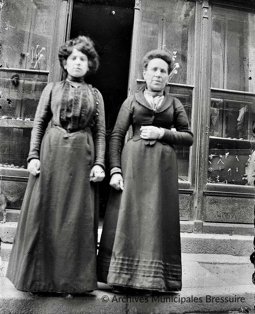 Deux femmes posent devant la devanture de leur boutique. Des pipes exposées dans la vitrine, à gauche et à droite, font penser à un bureau de tabac. Peut-être s’agit-il de celui qui se trouvait au 4 de la rue Gambetta et qui est visible sur une autre photo.