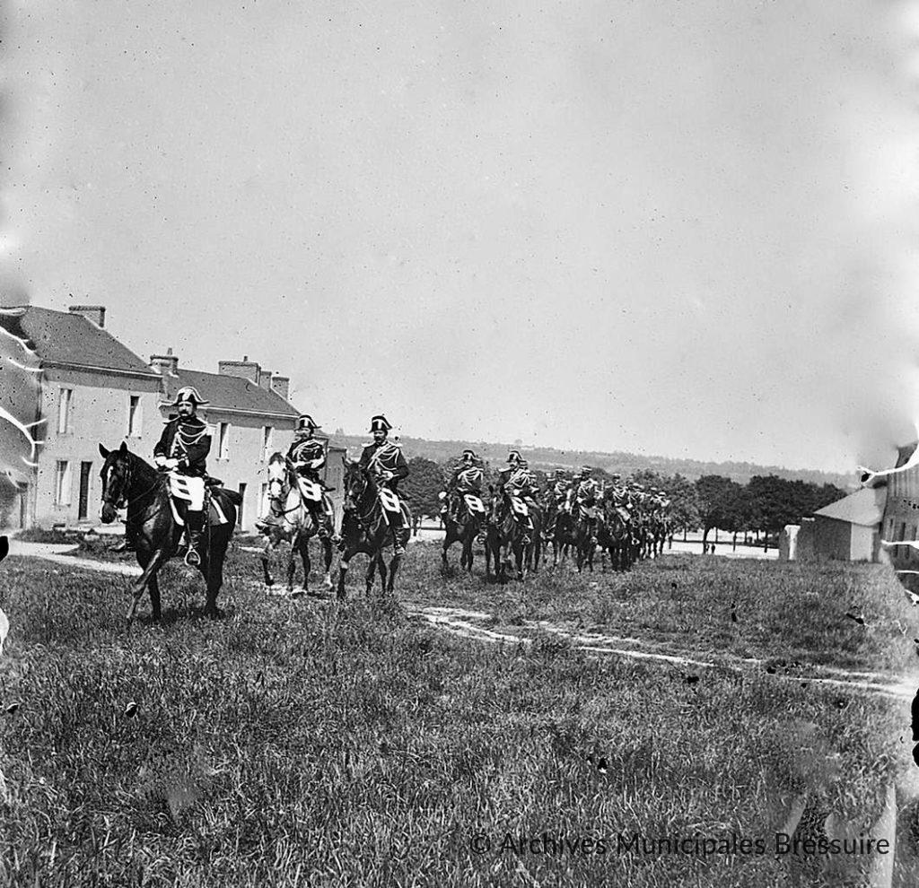 Une brigade de gendarmes à cheval traverse le champ de foire Saint-Jacques, à l’emplacement de l’actuelle place de la Libération. L’espace est délimité par des maisons récentes, dans un quartier encore en construction. En arrière-plan, les marronniers de la place Saint-Jacques et, au-delà, la campagne presque vierge d’habitations.