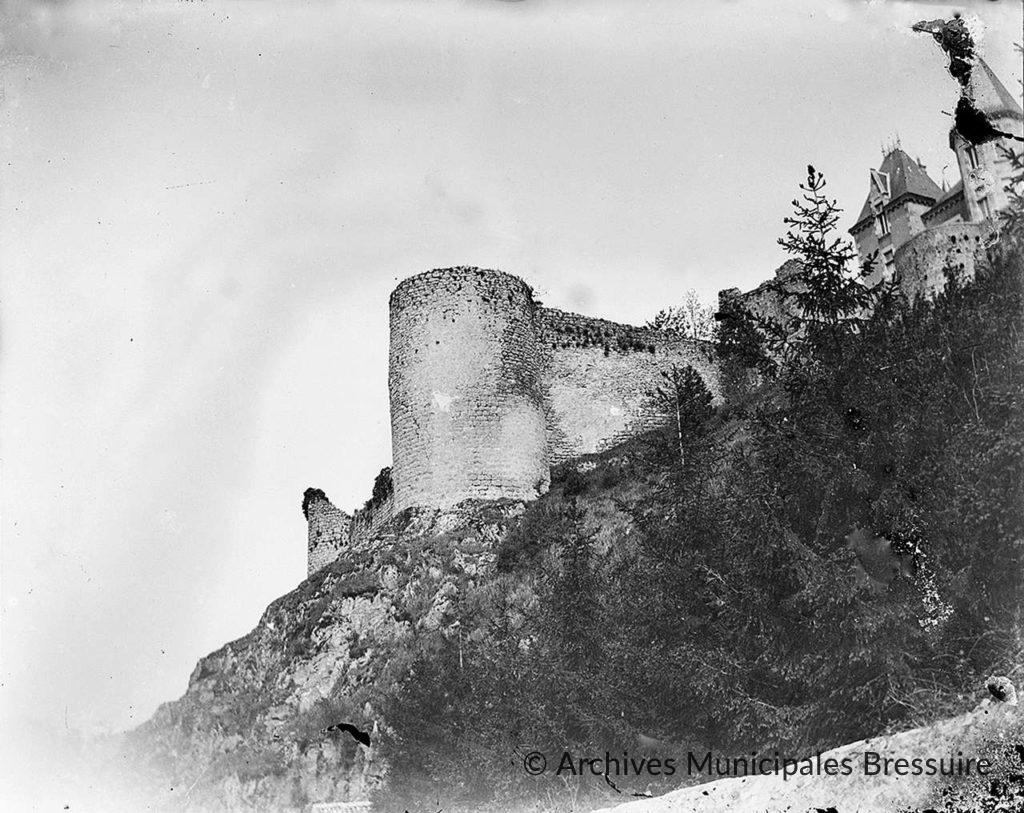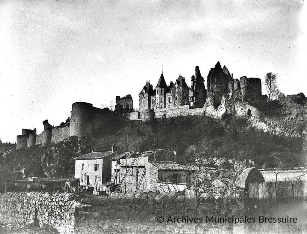 Vue du château de Bressuire depuis la rue du Péré. La photographie met en valeur la puissante tour du pilier massif, la dernière de l’enceinte extérieure, édifiée sur la partie la plus inaccessible du rocher. En haut à droite, le château « troubadour » que le maire Bathilde Bernard fit ériger à partir de 1876, année du rachat du château en ruines à la famille d’Abbadie.
