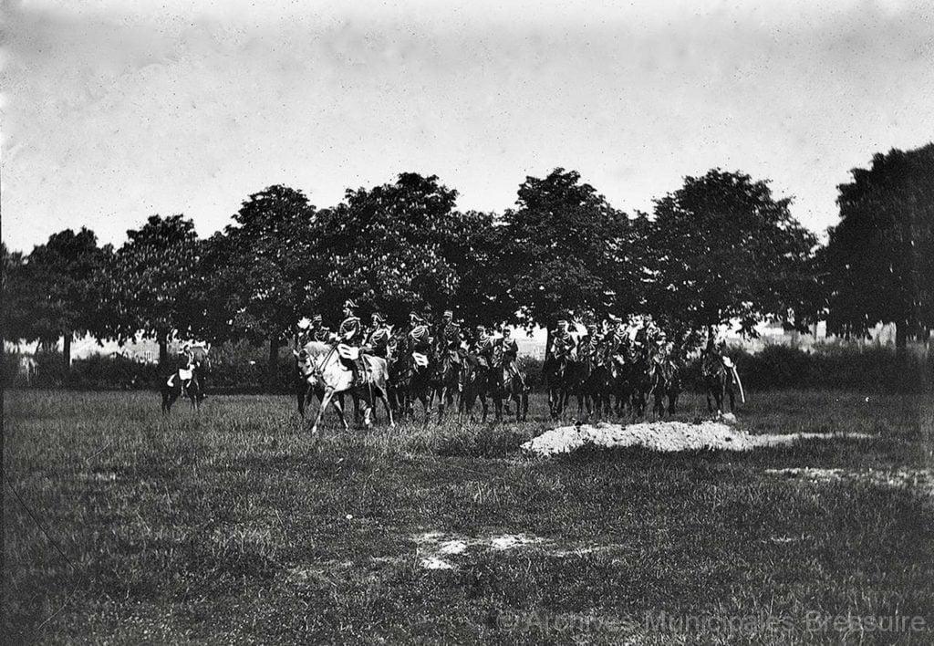 La brigade de gendarmerie à cheval dans un quartier encore non construit de la ville. Derrière la rangée de marronniers, on devine les bâtiments du centre urbain.