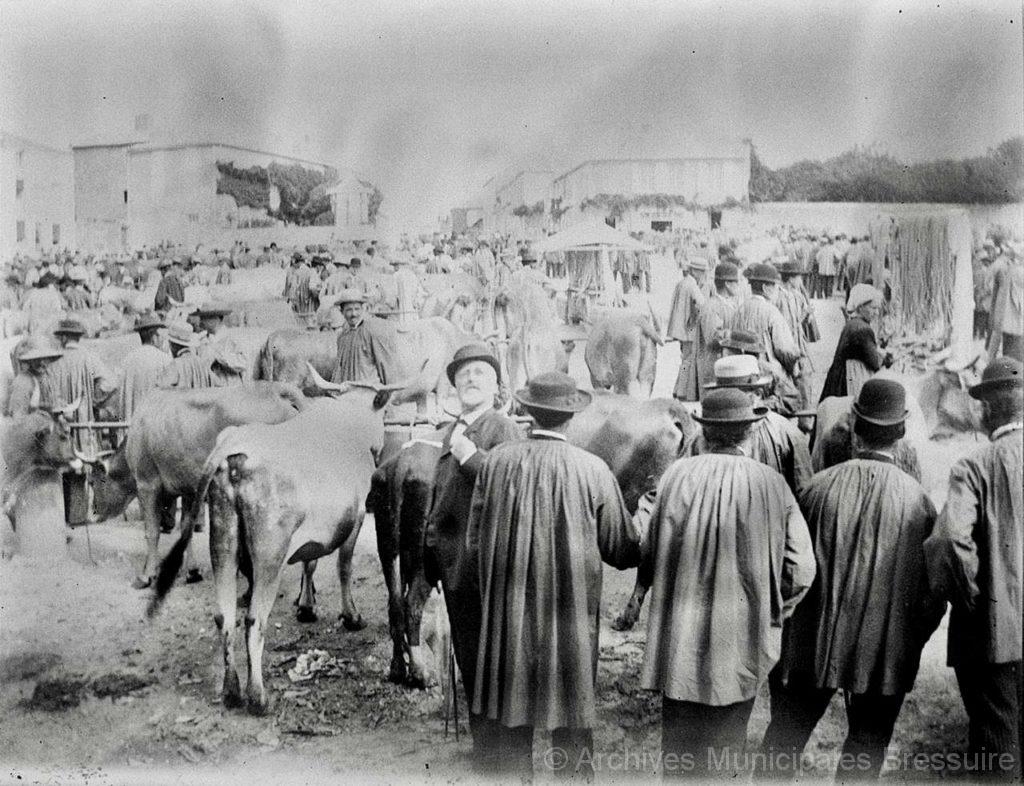 Le marché aux bestiaux de la place Dupin, dans la perspective de la rue de la cave. Il y a foule, et les discussions vont bon train. Les hommes portent le costume traditionnel, une blouse bleue flottante et un chapeau aux larges bords. On aperçoit une seule femme, affairée. Un homme en costume de ville, coiffé d’un chapeau melon, semble interpeller l’opérateur.