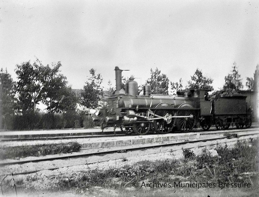 Une locomotive à vapeur de type 120 et son tender passent sur la voie ferrée, sans doute à Bressuire. Au tournant du siècle, la ville doit une grande partie de son développement économique et urbanistique au chemin de fer, symbole d’un progrès qui ne manque pas de fasciner les photographes.