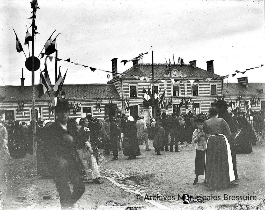 La foule se presse devant la gare de Bressuire solennellement pavoisée. Les regards se concentrent sur la porte de sortie des voyageurs, décorée d’une tenture. Près d’elle, on distingue la bannière de la Société musicale bressuiraise, prête à jouer quelques morceaux. L’invité semble d’importance. On peut faire l’hypothèse qu’il s’agit du ministre de la Guerre, le Général André, venu inaugurer, le samedi 24 octobre 1903, le monument élevé à la mémoire des soldats du canton tués au cours de la guerre de 1870-71. Henri Ardouin, président de la section des Anciens Combattants, fit d’ailleurs un discours à cette occasion.