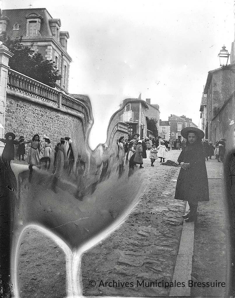 Sortie de l’école enfantine, dans le haut de la rue Duguesclin. La plupart des enfants, coiffés de grands chapeaux de paille ou de bérets, se dirigent vers la Grand’rue où quelques parents semblent les attendre. D’autres s’arrêtent pour discuter ou pour fixer l’opérateur, intrigués. La rue en terre battue est bordée de quelques pavés. On distingue un tas de crottins qui atteste la circulation régulière de chevaux. La gélatine de la plaque photographique a subi des déformations importantes, ce qui donne à la photo une allure un peu onirique.