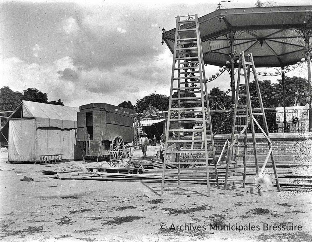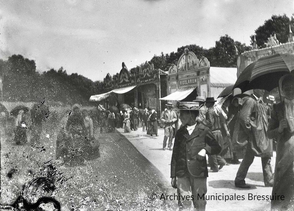 Cette photographie fait penser à un extrait du chapitre VI de la première partie des « Creux de maisons », publié en 1912 par le romancier Ernest Pérochon : « Cette foire de septembre, qui se tenait dans le quartier Saint-Jacques, le quartier neuf de la ville, attirait à Bressuire une grande foule. (…) Les filles s’engagèrent entre deux rangées de baraques qui faisaient, au milieu de la place, comme une rue large et houleuse. Autrefois, quand elles étaient petites, elles s’étaient bien extasiées à cette foire, devant les gens qui font des tours et qui montrent des bêtes. »