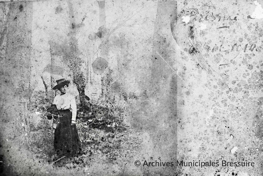 Une élégante jeune femme se promène dans un jardin ou un sous-bois. Une écriture manuscrite permet de préciser le lieu et la date du cliché : Bressuire, août 1910.