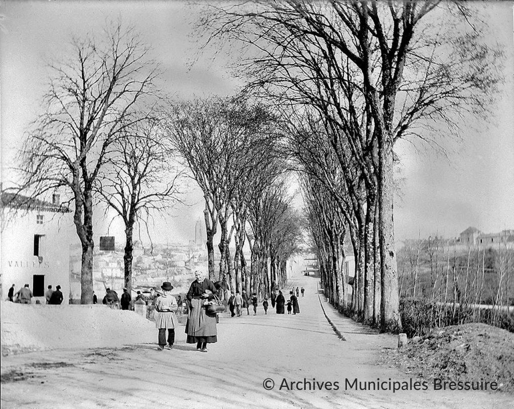 Vue de la route de Nantes peu avant d’arriver au pont de chemin de fer. À gauche, les maisons correspondant aux numéros 36 à 40 de l’actuel boulevard Alexandre 1er ont gardé la même physionomie. À droite, le mur a été détruit et le jardin remplacé dans les années 1960 par une station Total puis par un parking et un immeuble à usage commercial. La route est en terre battue et les piétons y stationnent sans aucun souci de la circulation automobile, encore très réduite.