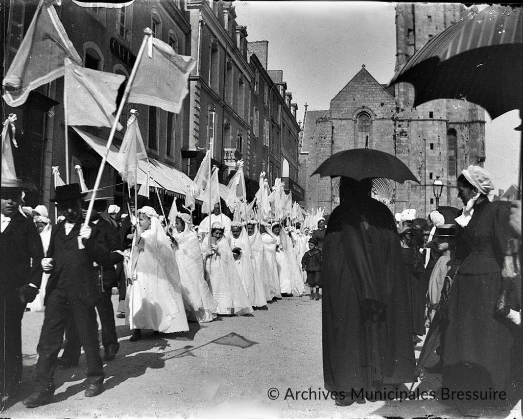 Sortant de l’église, une procession de communiantes longe la place Notre-Dame, précédées par des garçons en costumes sombres. Les enfants portent des drapeaux de tarlatane finement galonnée, probablement aux couleurs de la Vierge Marie, le bleu et le blanc. À droite, des femmes les observent, portant de grands parapluies pour se protéger du soleil. Un petit garçon en costume marin passe entre les rangées..