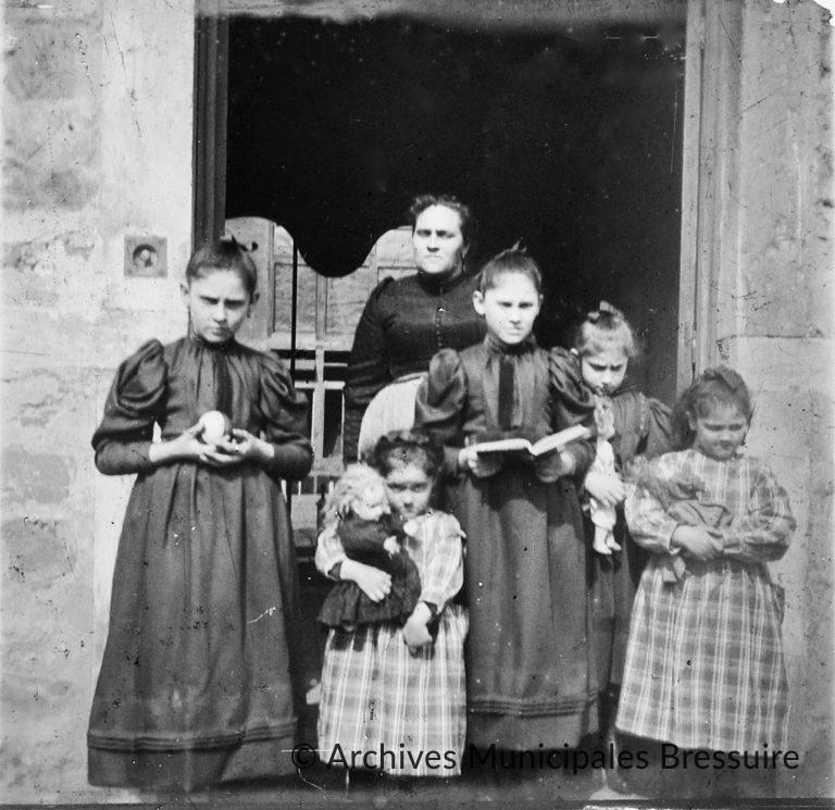 Jeanne Joly épouse Foucart et ses cinq filles sur le seuil d’une maison rustique. Les trois aînées, dont deux jumelles, sont nées à Blois. les deux plus jeunes sont nées à Constantinople (Istanbul) en 1890 et 1891. Cette photographie a donc été prise aux alentours de 1895.