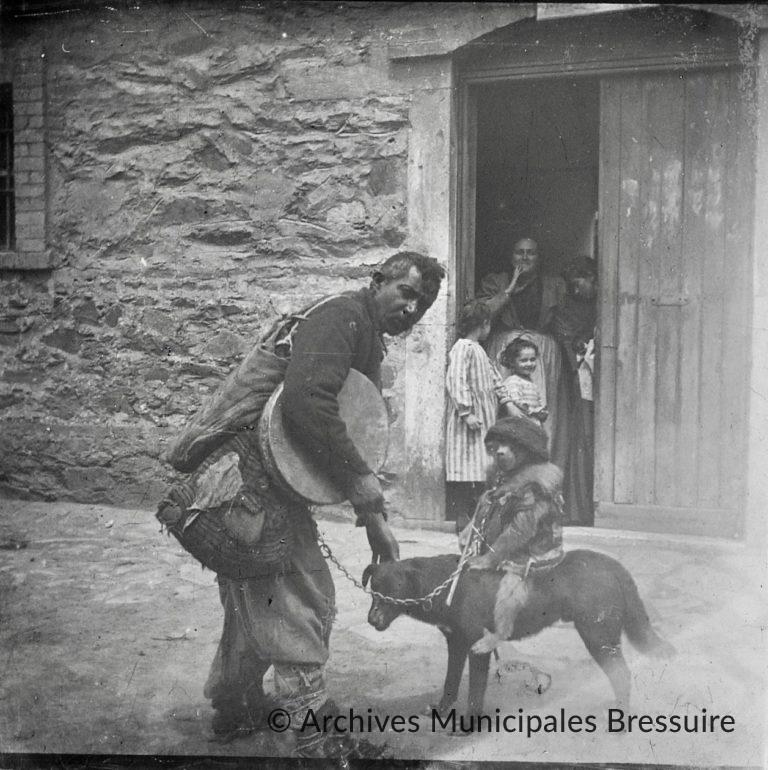 Jeanne Joly épouse Foucart et plusieurs de ses filles, sur le seuil de la même maison. Madame Foucart observe avec amusement un musicien ambulant qui regarde de son côté l’opérateur. Le musicien se penche vers son chien qui transporte un singe vêtu d’une veste et d’un bonnet. L’homme qui porte un tambourin, tient le singe enchaîné.
