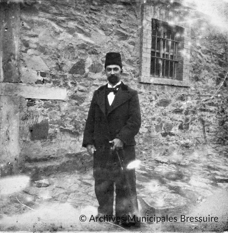 Photographie prise devant la maison des Foucart. Il s’agit du portrait d’un Ottoman, qui porte un fez et des vêtements à la mode européenne, et tient un parapluie dans sa main gauche. Sous le règne du Sultan Mahmoud II, au début du 19ème siècle, la mode européenne a progressivement remplacé les vêtements traditionnels, s’imposant comme un signe d’appartenance aux classes émancipées de l’Empire.