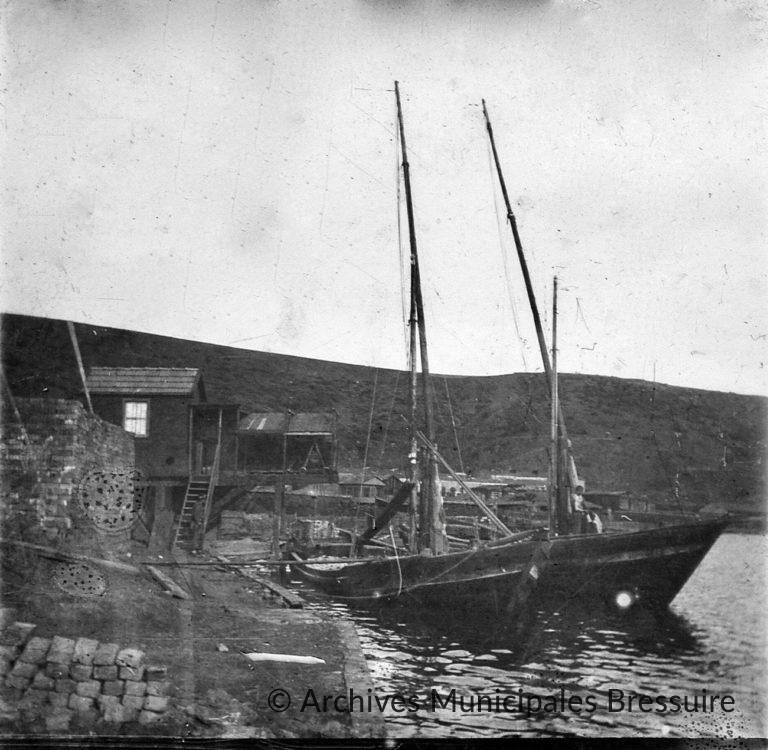 La photographie représente un petit aménagement portuaire, très probablement en lien avec la manufacture dirigée par Emile Foucart. A gauche, on distingue un imposant tas de briques qui est stocké sur la rive. Une cabane en bois, à laquelle on accède par un escalier, se prolonge par un ponton couvert d’un toit sommaire dissimulant un treuil. Les deux bateaux qui sont accostés sont utilisés comme moyens de transport. Il semble que l’opérateur saisit le moment où l’on est en train de descendre un tas de briques posées sur un plateau à l’aide d’un filin, tandis qu’au fond du bateau des ouvriers s’affairent pour les réceptionner.