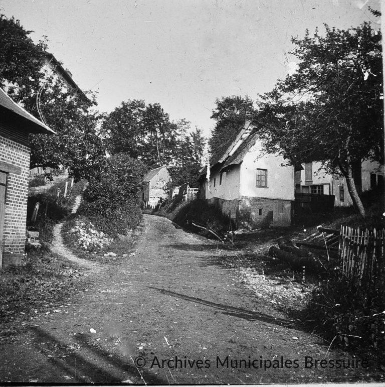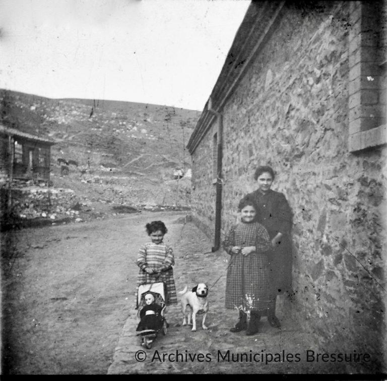 Près d’une petite montagne, on retrouve la même maison de plain-pied en pierres, avec deux fenêtres à encadrements de briques. A gauche, on distingue un autre bâtiment près duquel paissent quelques animaux. La photographie met en scène les trois plus jeunes sœurs Foucart, Hélène, Suzanne et Charlotte. Hélène tient un petit chien en laisse. Charlotte transporte sa poupée dans une poussette.