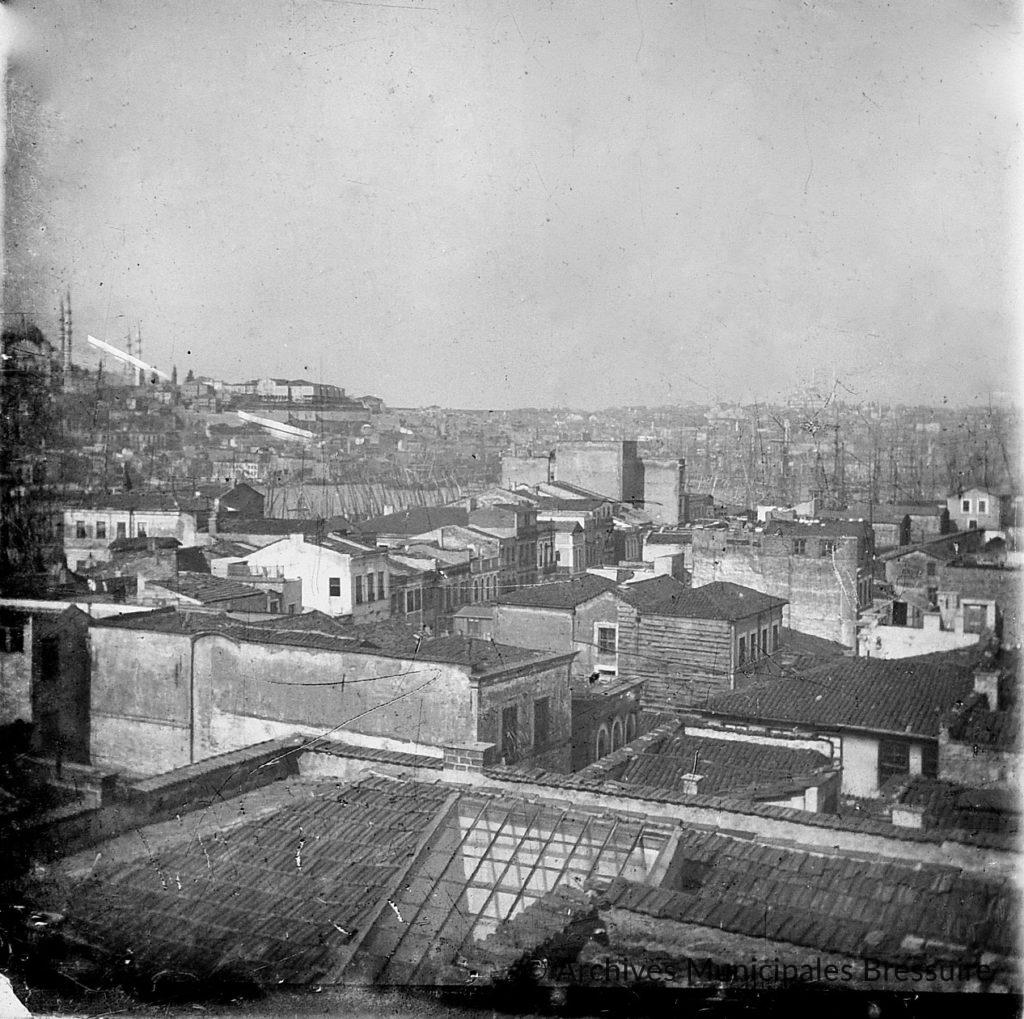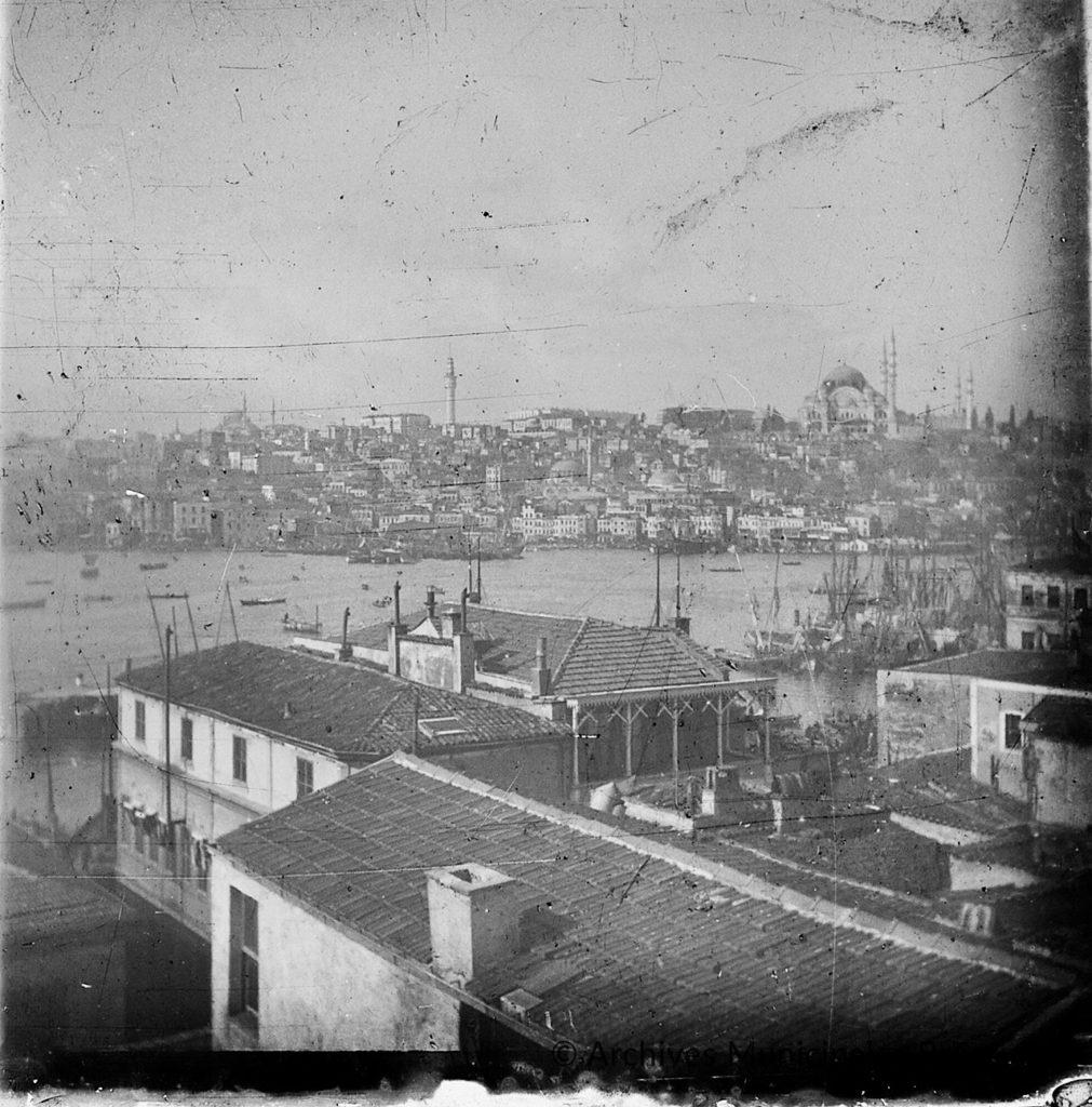 Constantinople, vue panoramique de la Corne d’or. Les deux images, qui se complètent, mettent en valeur l’architecture des bâtiments avec les toits couverts de tuiles, ainsi que la forêt des mâts sur le port. La mosquée Süleymaniye, avec ses quatre minarets, domine le paysage. La ville est alors en pleine période de modernisation, sous l’influence d’entrepreneurs et de banquiers. La photographie est prise depuis le quartier de Galata où la famille Camondo avait fait construire de nombreux immeubles, boutiques, usines, et … briqueteries, activité alors d’un excellent rapport.
