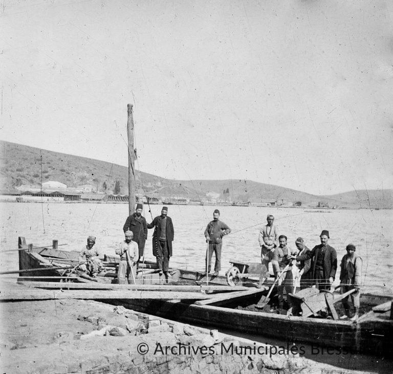 Le long du quai au premier plan se trouve amarré un long bateau à fond plat. Dix hommes sont à bord, dont quatre sont coiffés de fez, et les autres de turbans. Les deux brouettes ont servi à transporter la terre depuis la rive, terre qui a ensuite été pelletée par quatre ouvriers au fond du bateau. Deux grandes planches ont été disposées pour permettre le chargement. Trois des hommes qui portent le fez et sont couverts d’un long manteau semblent surveiller les autres. L’homme à gauche, tenant la corde, accroupi, est sans doute le pilote. À l’arrière-plan, devant un horizon de collines, on distingue le même aménagement portuaire que dans la photo précédente.