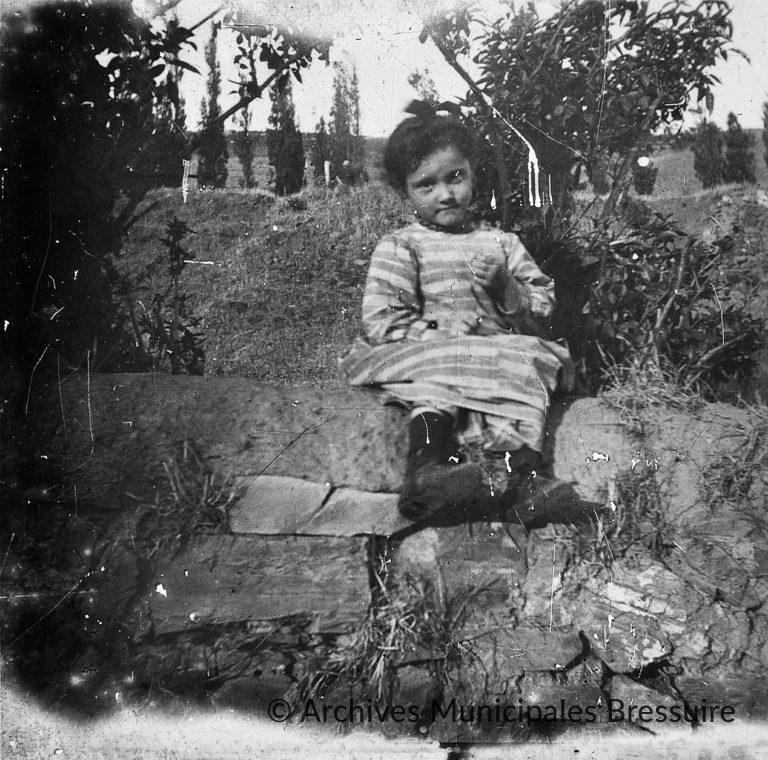 Charlotte, la plus jeune des sœurs Foucart, née à Constantinople en 1891, est assise sur un mur de pierres. Derrière le talus, on distingue une rangée d’arbres.