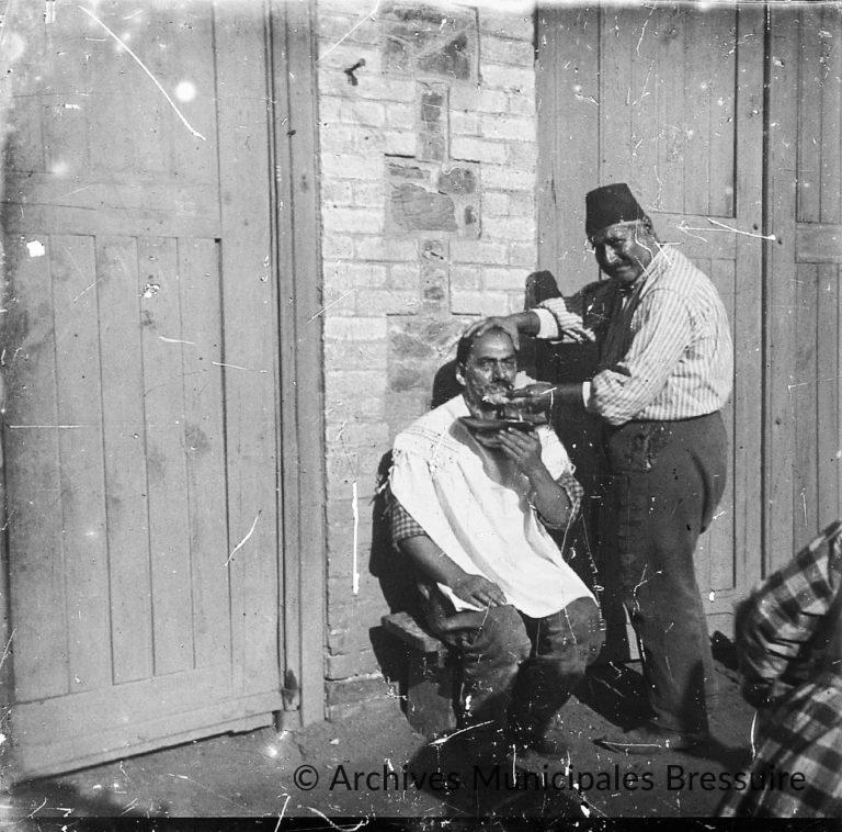 Un barbier rase un homme assis à l’extérieur d’un bâtiment. Tous deux se trouvent devant une portion de mur en briques encadrée par deux grandes portes en bois.