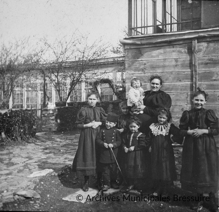 1902. Jeanne Joly et ses six filles : les jumelles Victoire et Émilie, Hélène, Suzanne et Charlotte, toutes deux nées à Constantinople, et la dernière, Jeanne, née à Blois le 2 décembre 1901. Le petit garçon, habillé à l’ottomane, n’est pas identifié. Photographie peut être prise à Blois sur le site de la manufacture Joly-Foucart.