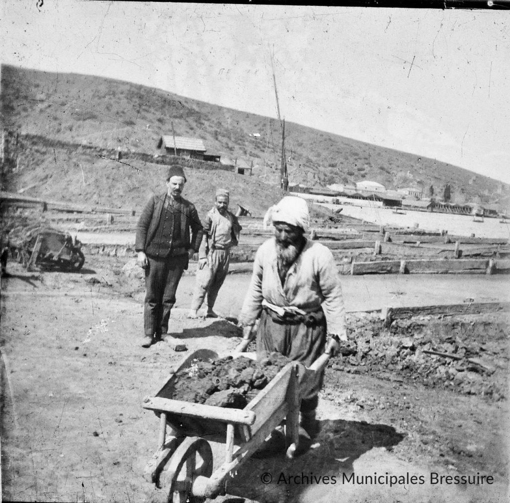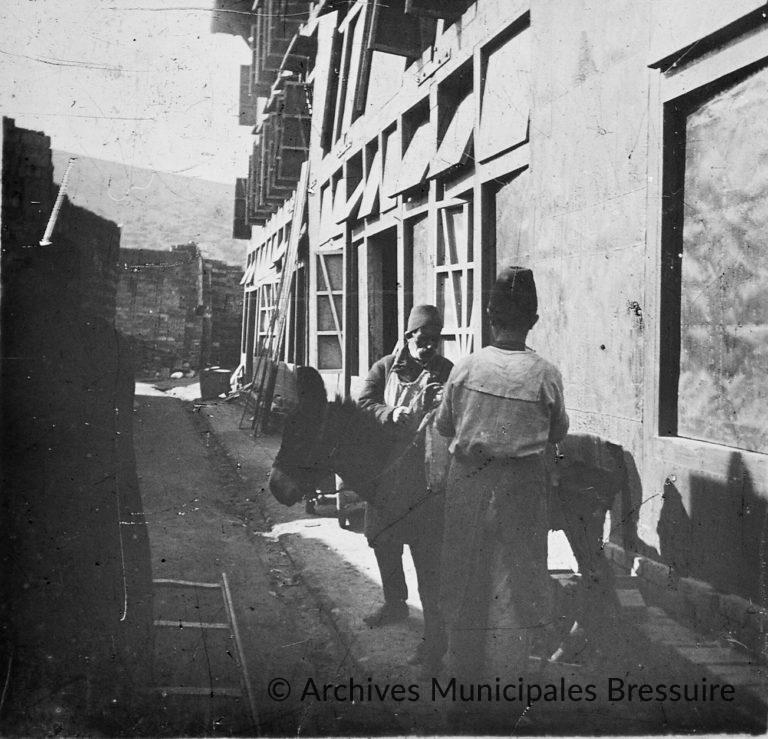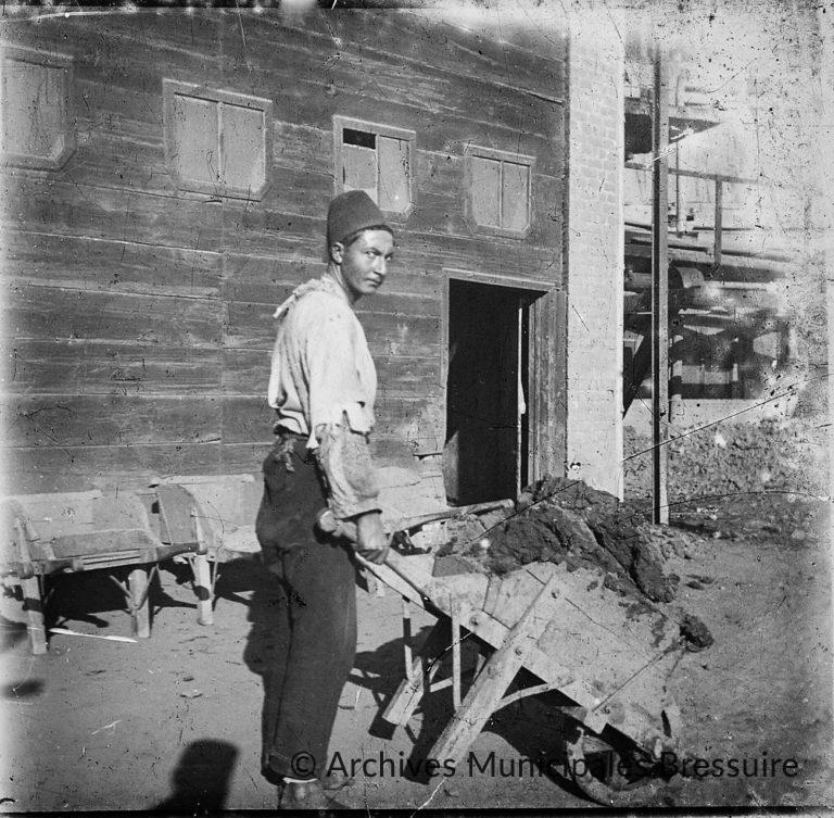 Un jeune ouvrier coiffé d’un fez transporte de la terre dans une brouette. Derrière lui, d’autres brouettes sont alignées le long d’un baraquement. A droite, en arrière-plan, des formes aux reflets métalliques pourraient évoquer une machine-outil à étirer, destinée à la fabrication industrielle de briques, et dont Foucart était un spécialiste.