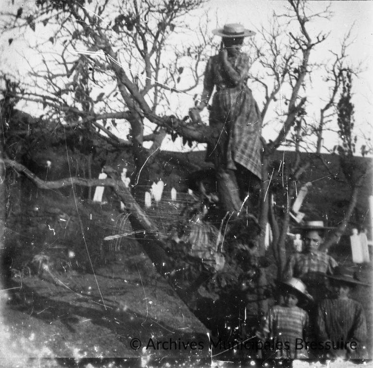 Les sœurs Foucart, vêtues de robes à carreaux et coiffées de chapeaux de paille. Une des deux aînées est montée dans un arbre.