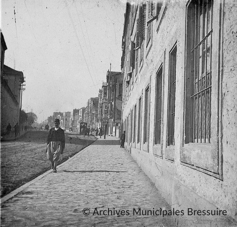 La façade du Lycée Notre Dame de Sion, à droite, sur l’actuel boulevard de la république à Istanbul, dénommé Cumhuriyet Caddesi. On distingue en arrière-plan la façade baroque de la cathédrale du Saint-Esprit, principal édifice de la ville consacré au culte catholique romain. De l’autre côté du boulevard, la façade d’un bâtiment militaire et dans le lointain, les arbres du cimetière arménien, aujourd’hui détruit. Le lycée Notre-Dame de Sion est encore aujourd’hui un prestigieux établissement francophone, le premier à avoir accueilli des jeunes filles sous l’ère ottomane, dès 1856. Cette photo représente donc très probablement le lieu où les demoiselles Foucart étaient scolarisées.