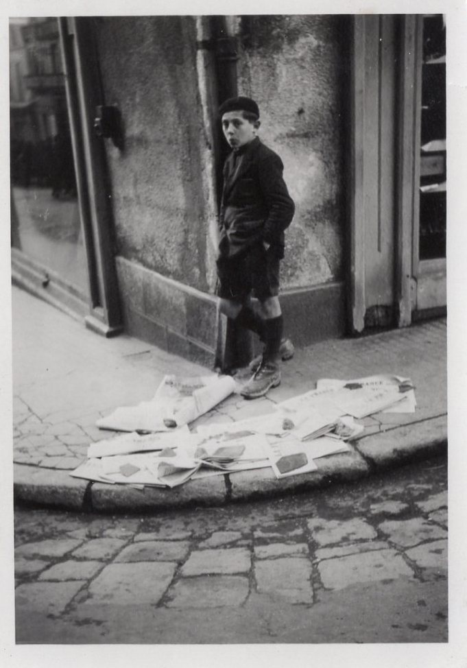 Un petit vendeur de journaux, dans l’angle de la rue Gambetta et de la place Notre-Dame, adossé au magasin d’Alfred Garand (aujourd’hui une agence immobilière). Lui en revanche fixe bien l’objectif, décontracté et sifflotant. Une carte postale des années 1940.