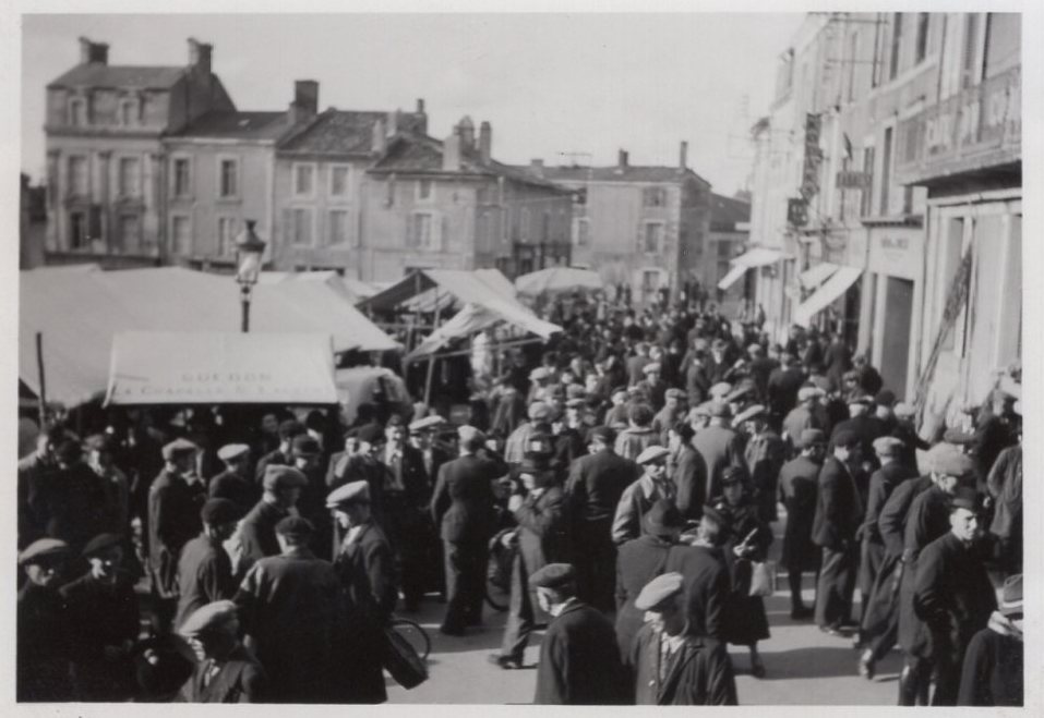 Un jour de marché, à une époque où les forains étaient installés sur la place Notre-Dame et l’alimentation sous les halles devant la mairie (détruites dans les années 1970).