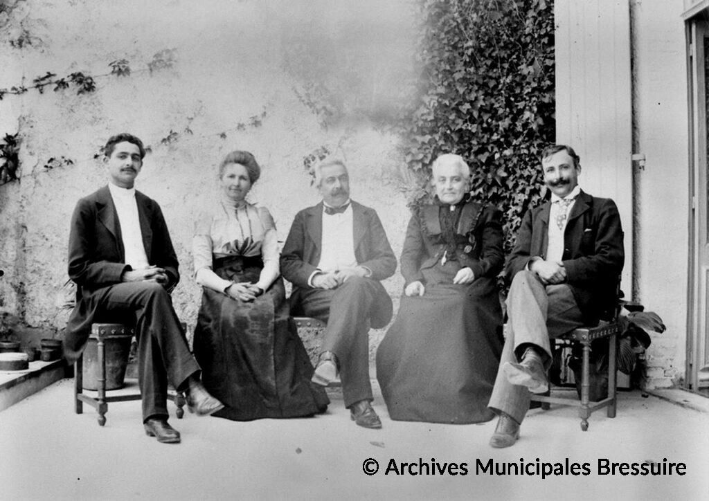 Sur la terrasse. La famille Ardouin : à gauche, Paul Ardouin ; au centre, le couple formé par Henri Ardouin et son épouse Hélène, née Foucart ; Léopold Métayer, gendre des Ardouin ; à droite, sans doute la grand-mère Ardouin née Joséphine Ripault, mère de Henri.