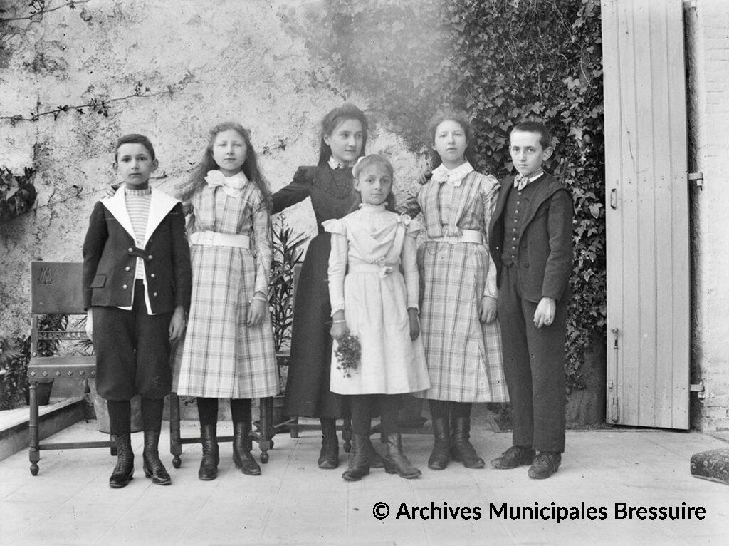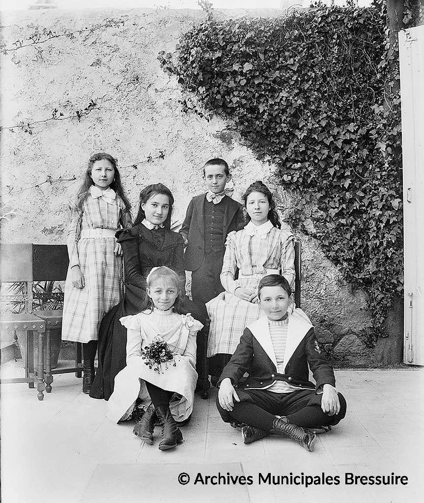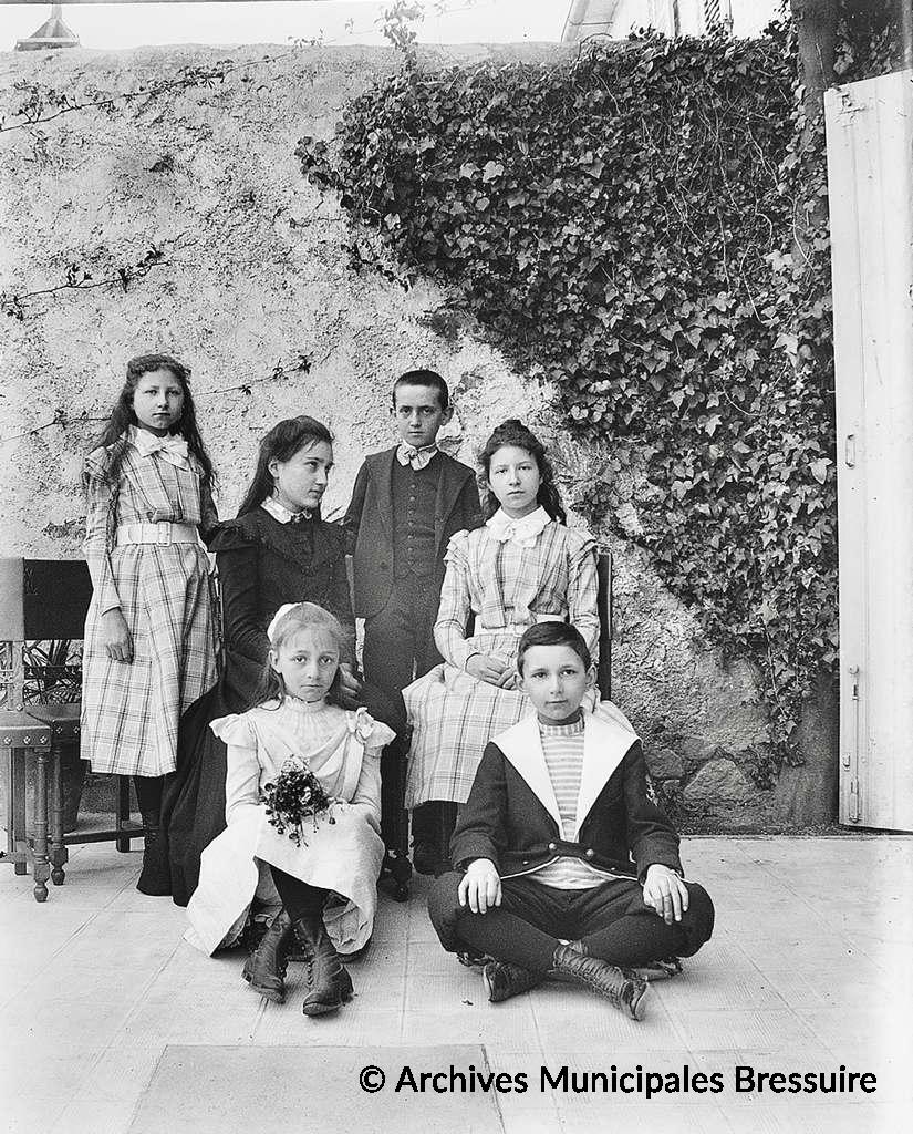 Plusieurs enfants des familles Ardouin-Foucart-Métayer posant sur la terrasse. On reconnaît au centre Louise Bouju, et tout à fait à droite, son frère Pierre Bouju. Le chiffre AM (pour Ardouin-Métayer) est visible sur le dossier en cuir de la chaise, à gauche.