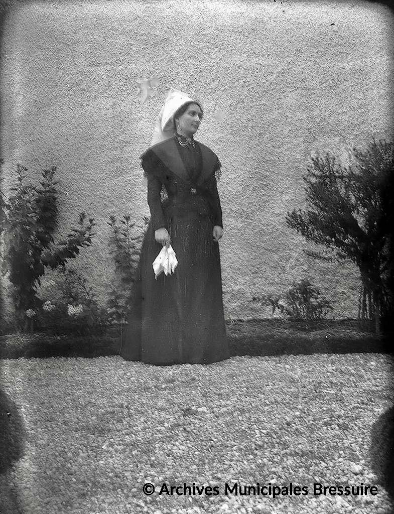Portrait de femme. Commentaire des responsables des collections du Musée de la vie rurale et de la coiffe à Souvigné (79) : « la photographie présente une femme en berthe (type de châle très en mode dans les années 1890) et portant une coiffe « Cassé de Moncoutant ». Cette coiffe fait partie des Gâtinelles, avec la Belle fille de Parthenay et les Cornes de Secondigny (forme similaire mais aux angles supérieurs très pointus formant une silhouette en triangle) ».