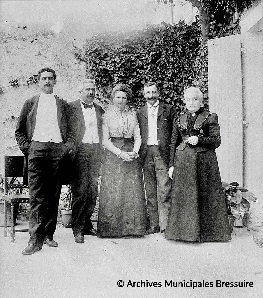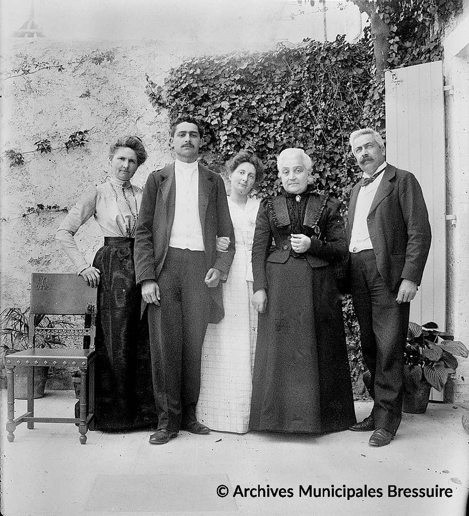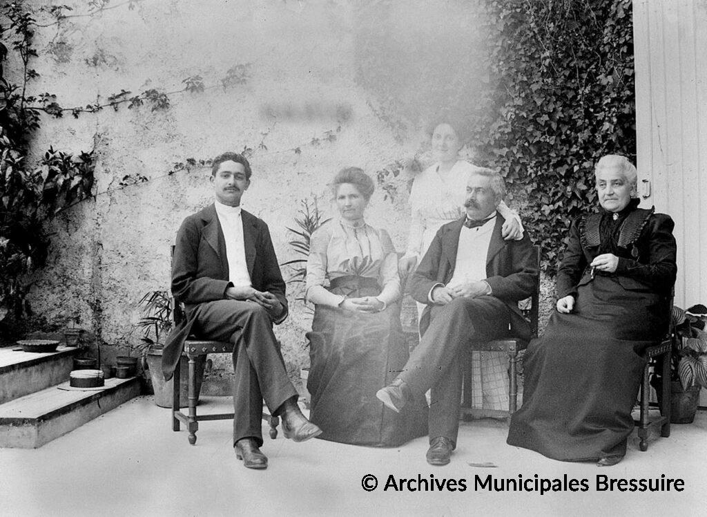 Sur la terrasse. La famille Ardouin : à gauche, Paul Ardouin ; au centre, ses parents Hélène (née Foucart) et Henri Ardouin ; debout derrière eux, sans doute leur fille Nelly Ardouin, sœur de Paul ; à droite, sans doute la grand- mère Ardouin née Joséphine Ripault.