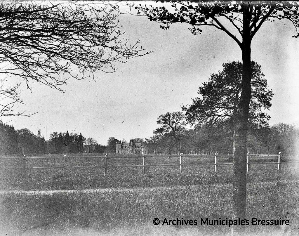 Vue du château de Vaudoré et de son parc, près de Saint-Jouin-de- Milly. Le château d’origine appartient à la famille de la Forêt-Montpensier, et passe dans la famille La Fontenelle en 1758. Il est détruit en 1853 et remplacé par le château actuel, inspiré par l’architecture du XVIIème siècle.