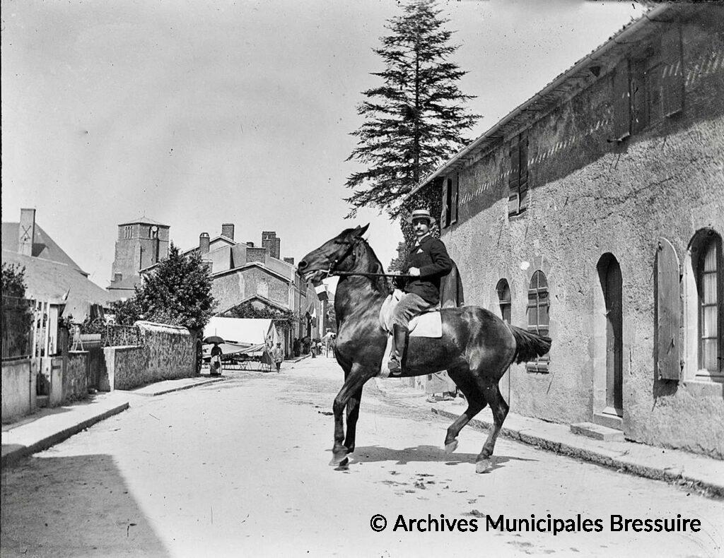 Un cavalier, sans doute le Docteur Léopold Métayer, posant dans la rue des Halles (aujourd’hui avenue du Maréchal Juin) à Moncoutant. En arrière-plan à gauche, on peut observer le clocher roman de l’église Saint-Gervais et Saint-Protais, et, sur la place des Halles, un étal de marchandises protégé par un auvent.