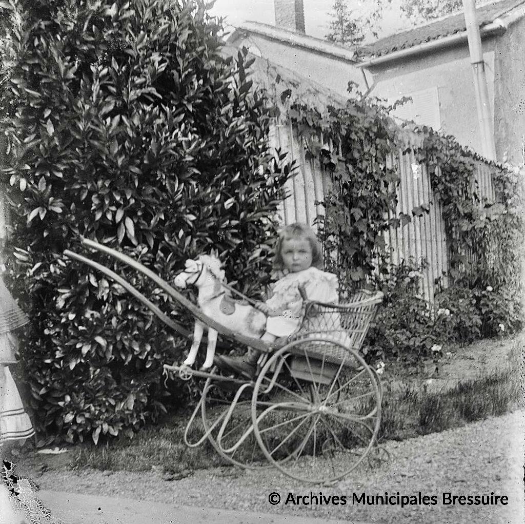 Michel (né en 1900) ou Alain (né en 1906) Métayer pose dans sa voiture d’enfant en osier. La photo est sans doute prise dans le jardin de la famille Métayer à Moncoutant.