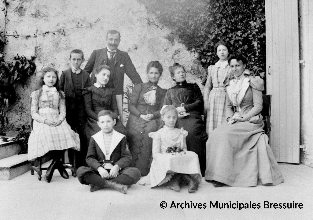La famille Ardouin : Hélène Foucart épouse d’Henri Ardouin, ses enfants Paul et Nelly Ardouin ; sans doute la grand-mère Ardouin née Joséphine Ripault ; son fils Henri Ardouin ; On devine le chiffre AM sur le dossier de la chaise, pour Ardouin-Métayer.